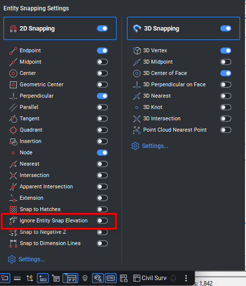 If you are a BricsCAD user doing 2D drafting just toggle the ESNAP setting “Ignore Entity Snap Elevation” ON. The screenshot below from the BricsCAD ESNAP list shows where to find the setting.